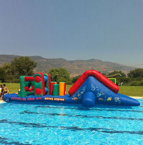 מתקן מתאים לתוך בריכת שחייה אטלנטיק על המים מסלול מכשולים מאד מהנה לילדים עוברים מספר מכשולים מטפסים ומתגלשים במהירות לתוך המים בבריכה